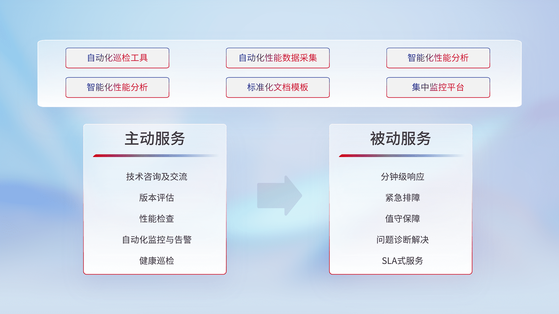 智能化工具和标准化文档,,保障服务质量,,提供主动服务(包含技术咨询、、、版本评估、、、、性能检查、、、自动化监控与告警、、、健康巡检)和被动服务包含(分钟级响应、、紧急排障、、值守保障、、问题诊断解决、、、SLA服务)。。。。